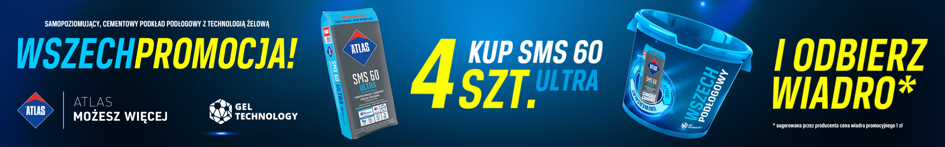 Kup 4 sztuki ATLAS SMS 60 ULTRA – wszechstronnego, samopoziomującego cementowego podkładu podłogowego z technologią żelową – a otrzymasz wiadro idealne do wylewek!