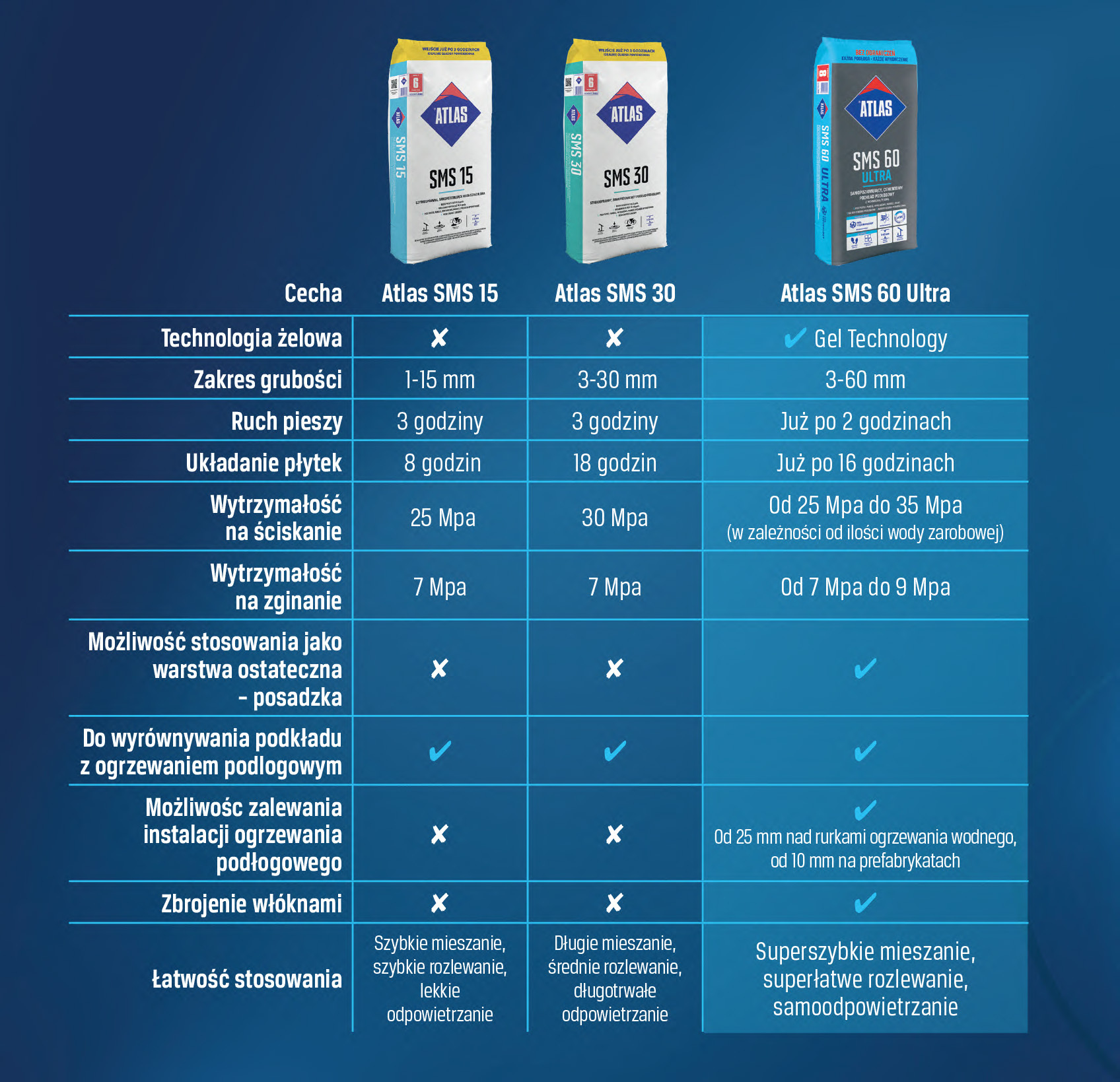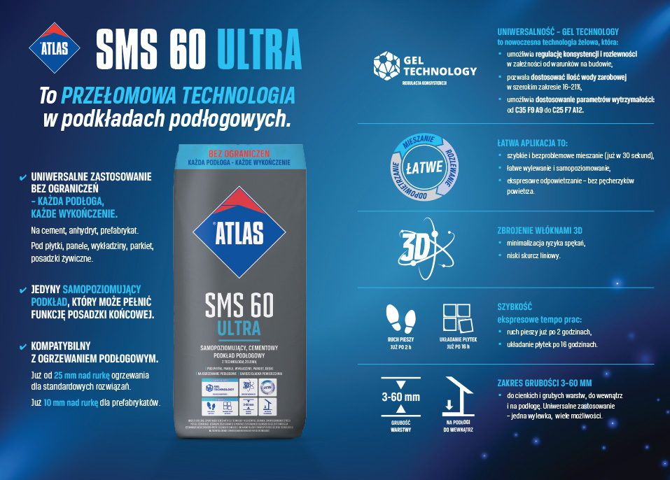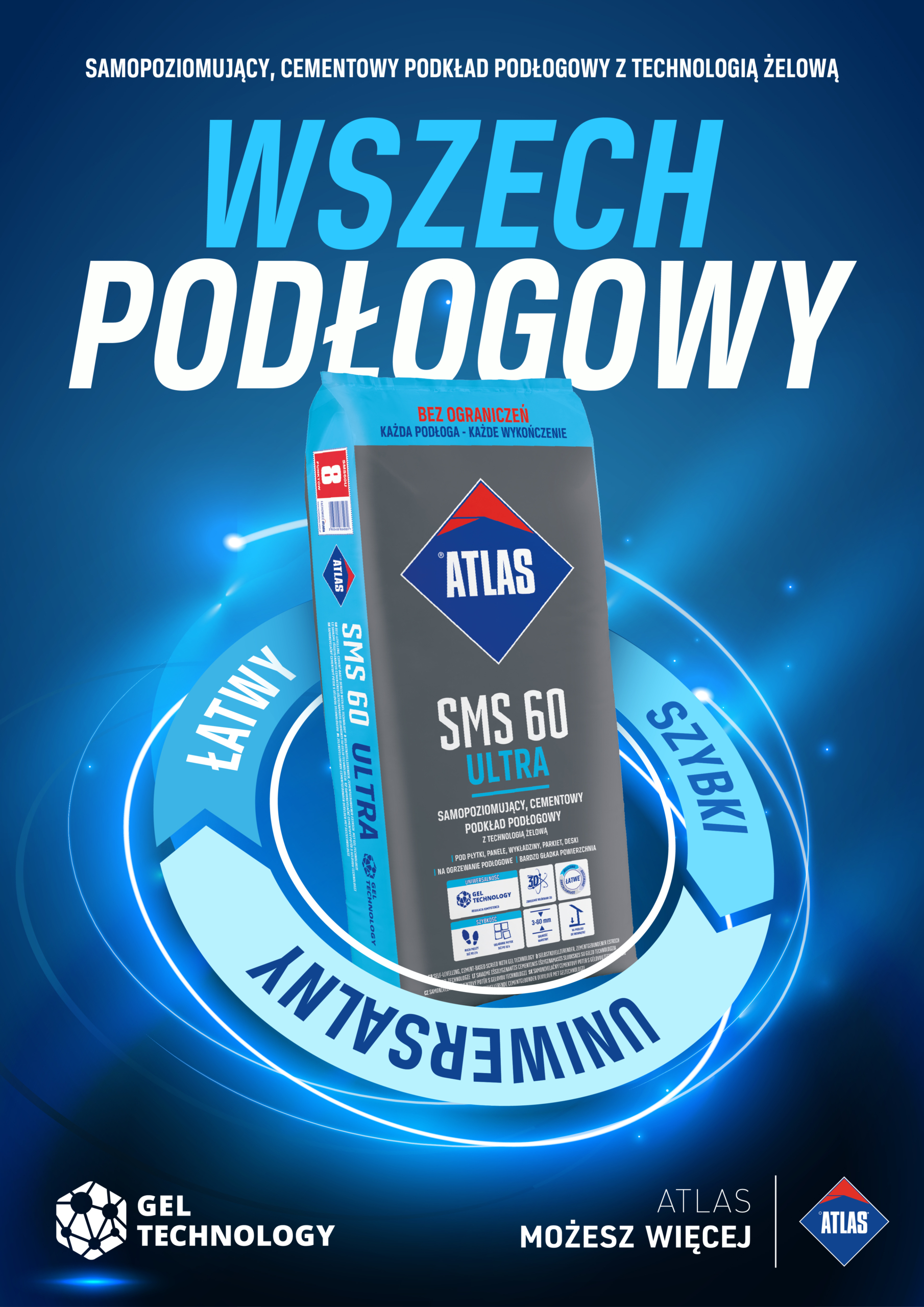 ATLAS SMS 60 ULTRA to żelowy, szybkosprawny, samopoziomujący podkład podłogowy o wszechstronnym zastosowaniu, doskonały do różnych wariantów budowy podłogi, systemów ogrzewania podłogowego. Może również stanowić samodzielną posadzkę.