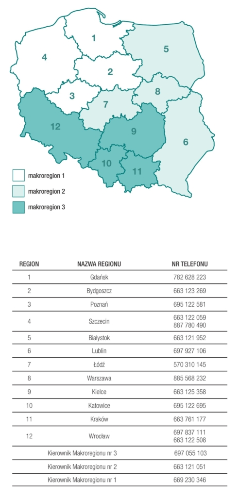 Każdy z naszych Szkoleniowców – Doradców Technicznych działa na ściśle określonym obszarze. Wszyscy są wyposażeni w profesjonalny sprzęt, który pozwala skutecznie diagnozować problemy i proponować odpowiednie rozwiązania. Dysponują także zapleczem niezbędnym do prowadzenia szkoleń teoretycznych, pokazów, instruktaży oraz warsztatów produktowo-technologicznych, również bezpośrednio na budowie.